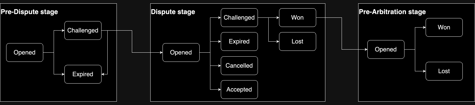 OrchestratorX's unified disputes module uses the following stages and statuses to track your disputes: