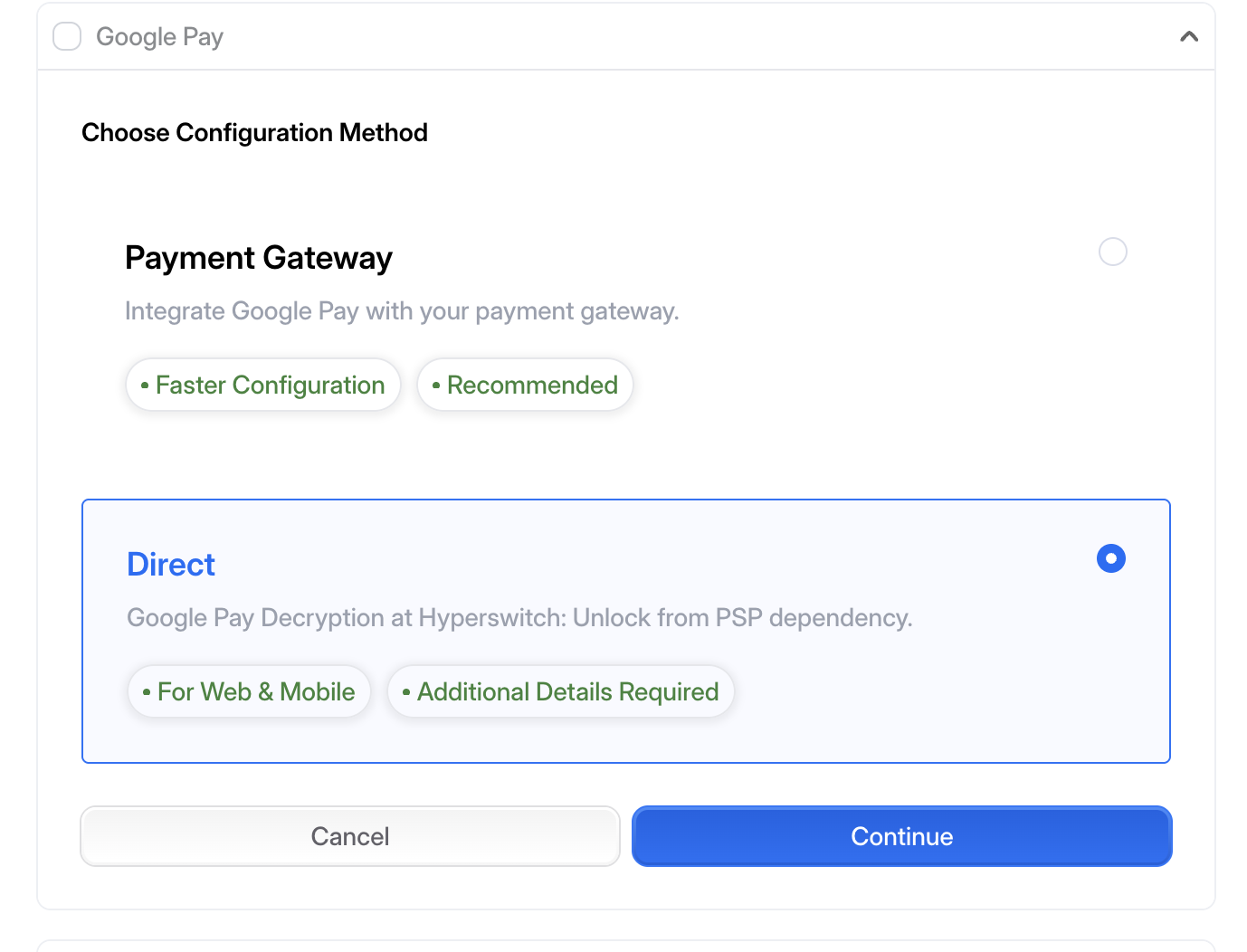 - While selecting Payment Methods, click on Google Pay in the Wallet section, In 'Choose Configuration Method' tab select 'Direct'.