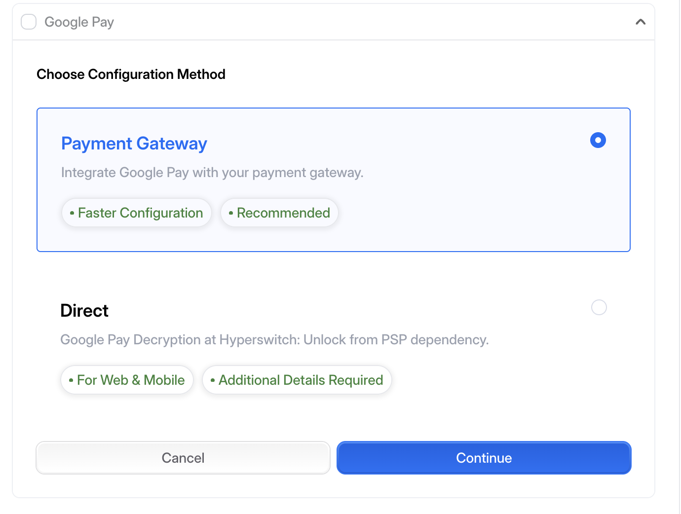 - While selecting Payment Methods, click on Google Pay in the Wallet section, In 'Choose Configuration Method' tab select 'Payment Gateway'.