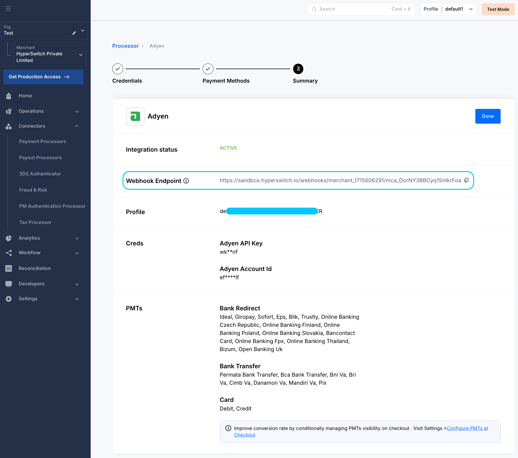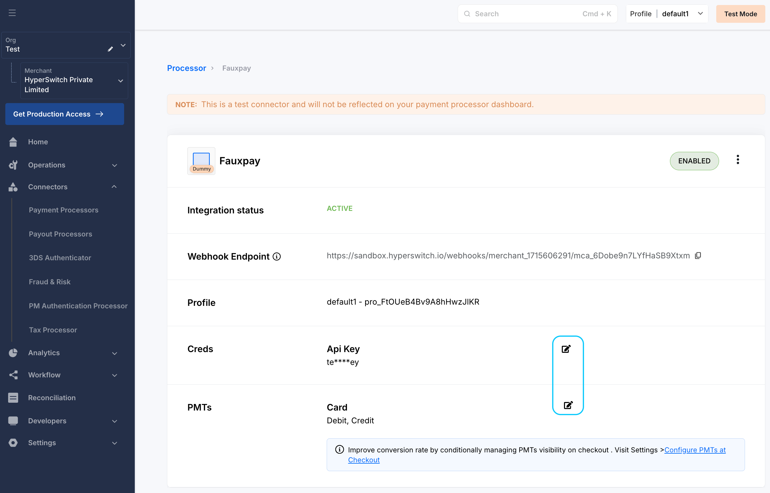 • Click on the edit icon (📝) alongside the API keys, this will take you to a pop-up to enter the credentials for the connectors.