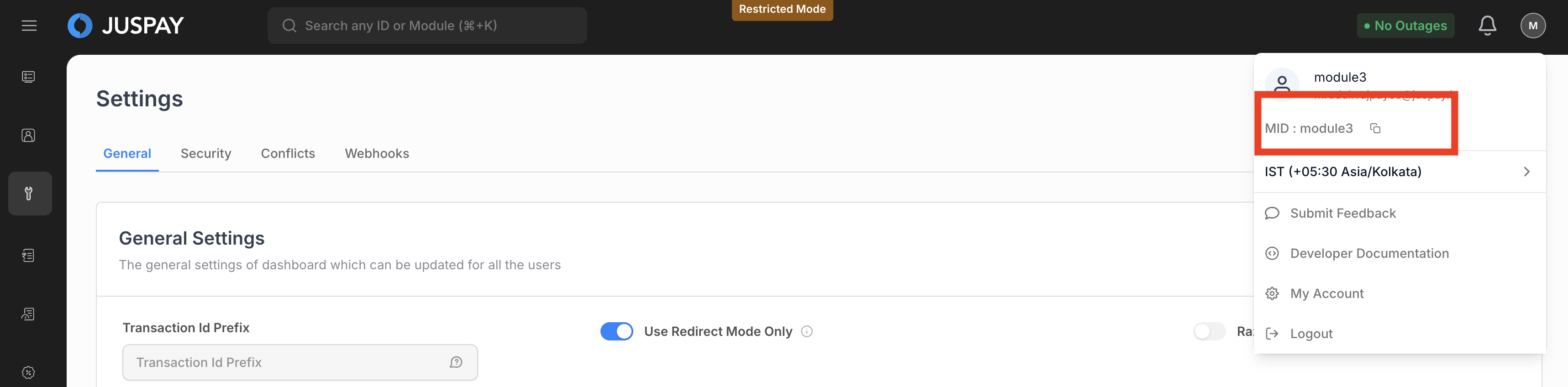Payments > Setting > Security. For more instructions on how to create an API Key, refer to this guide. - Enter your Hypercheckout merchant id. You can find this by clicking on your account symbol in navbar.