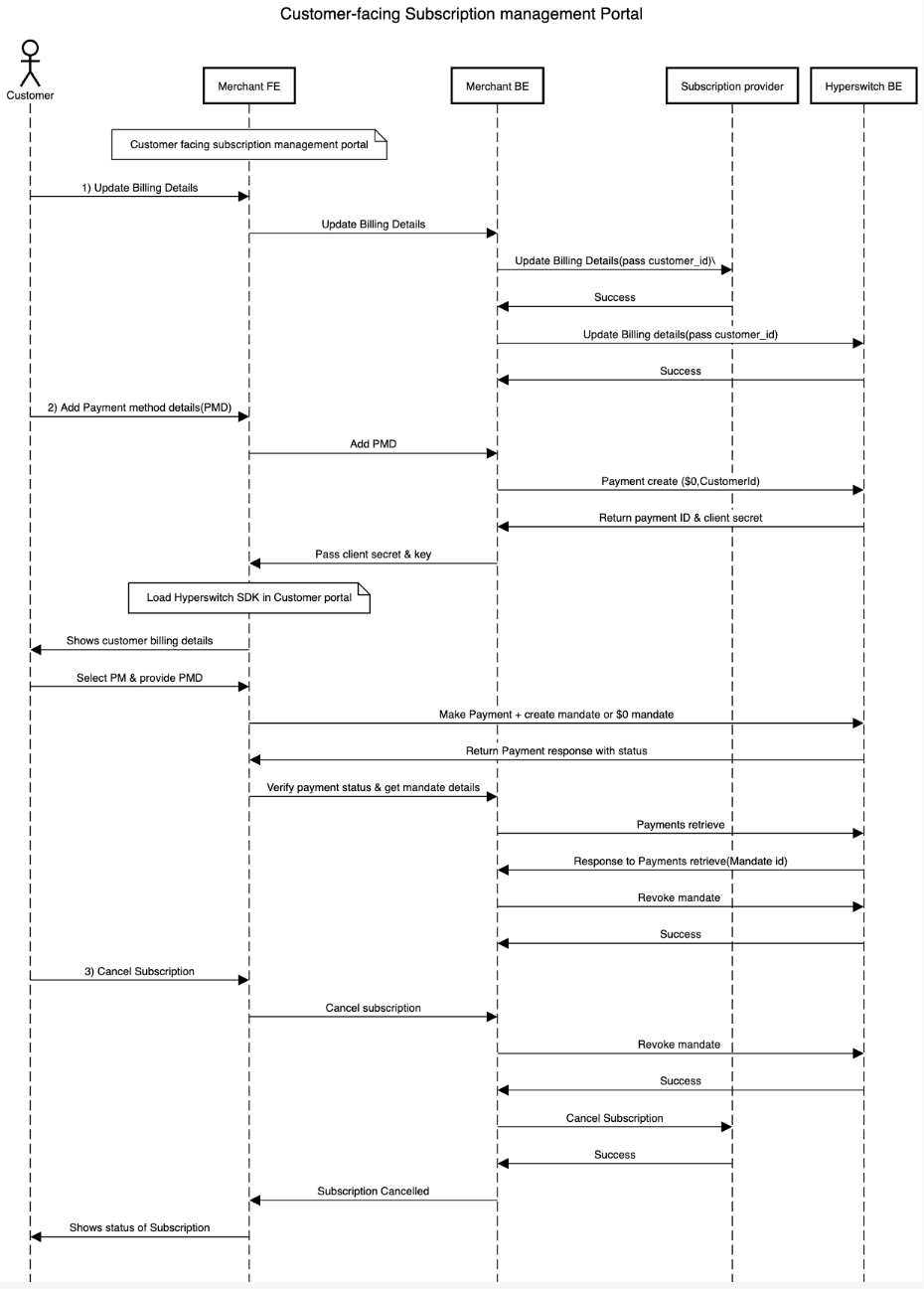 The customer-facing subscription management interface allows the customers to modify their billing address, add new payment method details for subscription payments and cancel subscription. If a merchant offers a subscription management portal then here's how OrchestratorX can support: