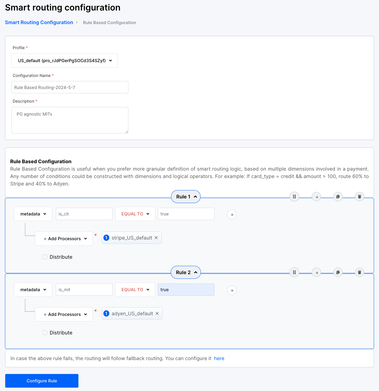 According to the above configured rule all the CITs for the specific business profile should be routed through Stripe and MITs through Adyen.
